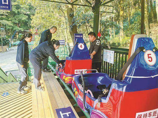 海沧区市场监管局开启春节全链条护航模式,为吃住行游购娱筑牢安全防线。图为执法人员对天竺山森林公园特种设备“丛林飞车”开展节前检查。
