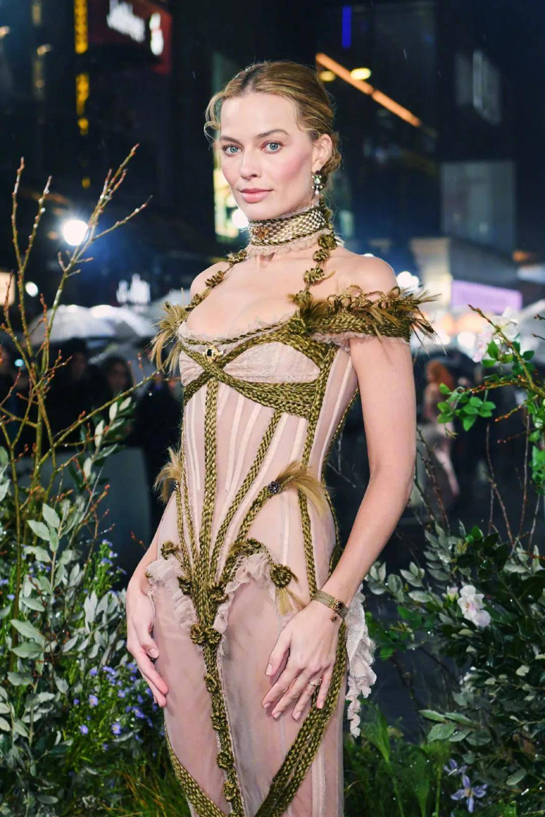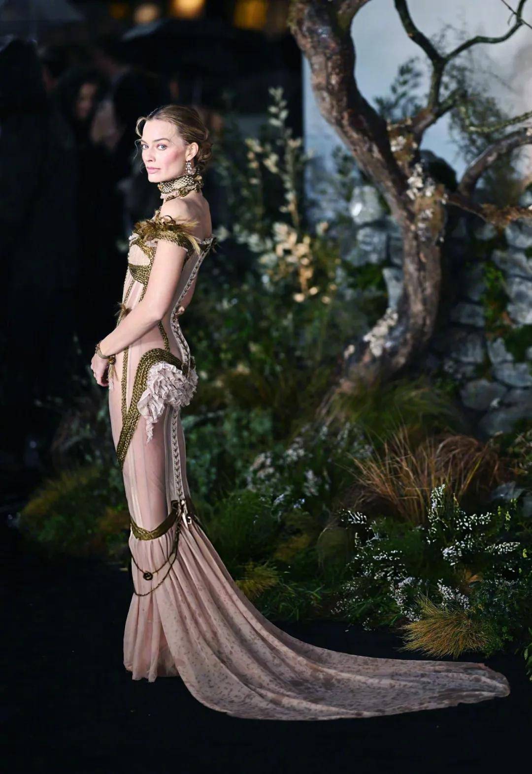 《呼啸山庄》洛杉矶首映After Party的活动中,Margot上身了一件来自Roberto Cavalli 2004秋冬系列的红金色短裙,色彩浓烈又富有层次,紧身低胸廓形勾勒曲线,荷叶边设计凸显灵动。